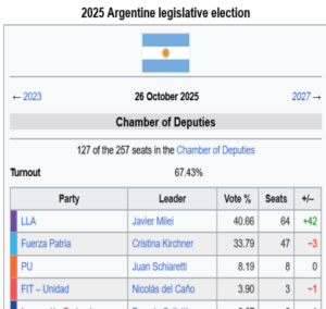 The parliament remains 99% in the hands of various bourgeois parties. The President and his LLA lists (this time including Pro) are benefiting from an improvement in the economic situation (5.2% growth expected in 2025, with inflation slowing to 36.6%). The government is bolstered by the mid-term elections to renew half of the deputies and one-third of the senators.